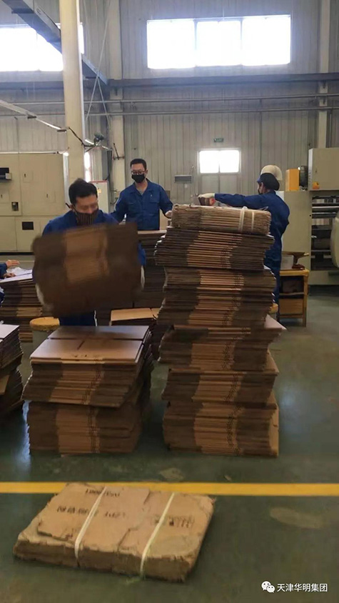 上班人員全部為本地未離津人員,且體溫正常、身體狀況良好。截止到2月5日,華明紙箱廠為天津施特雷生物科技有限公司生產(chǎn)特莫森包裝紙箱和次氯酸鈉包裝紙箱10萬個,為天津市化學試劑研究所生產(chǎn)包裝箱16萬個,天士力醫(yī)藥集團生產(chǎn)5.5萬個,北京諾華制藥生產(chǎn)5.6.萬個,瑞普(天津)生物藥業(yè)有限公司生產(chǎn)2.6萬個,為廣州寶潔生產(chǎn)洗手液包裝箱15萬個。全力服務疫情防控物資生產(chǎn)單位。車間里忙碌的工人和隆隆的機器聲都在和這場疫情賽跑。眾志成城,共克時艱,抗擊疫情華明集團在行動!