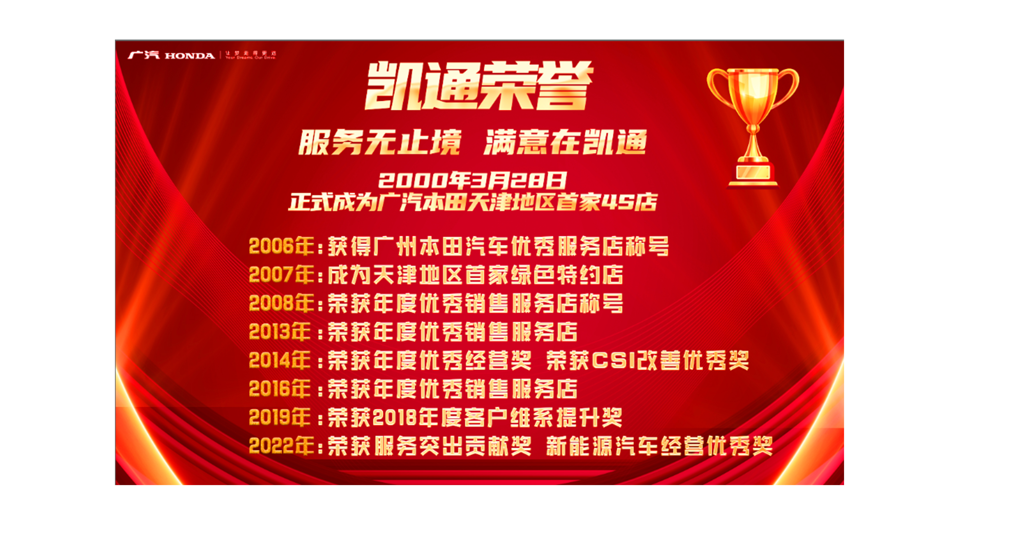 天津凱通汽車服務(wù)發(fā)展有限公司在廣汽本田汽車有限公司及社會(huì)各界朋友的大力支持下,恪守“服務(wù)只有起點(diǎn),滿意沒有終點(diǎn);質(zhì)量精益求精,服務(wù)盡善盡美”的服務(wù)宗旨,不斷開拓、進(jìn)取,以可靠的質(zhì)量、低廉的價(jià)格、優(yōu)質(zhì)的服務(wù)竭誠(chéng)為廣大客戶服務(wù)。服務(wù)無止境,滿意在凱通!